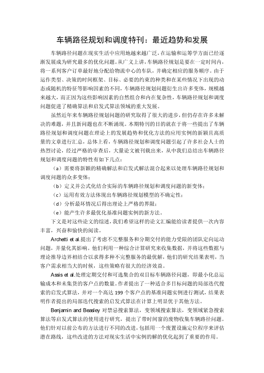 车辆路径规划和调度特刊:最近趋势和发展外文翻译资料