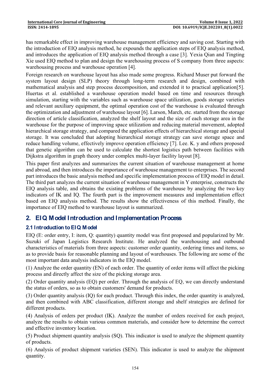 本文首先分析和总结了国内外仓库管理的现状,然后介绍了仓库管理对企业的重要性。第二部分详细介绍了EIQ模型的基本分析方法和具体实施过程。第三部分分析了Y企业仓库管理的现状,构建了EIQ分析表,通过对IK和IQ两个关键指标的分析,得出了仓库存在的问题。第四部分是基于EIQ分析方法的改进措施和实施效果。结果显示了该方法的有效性。最后,总结了EIQ方法对仓库布局的重要性。