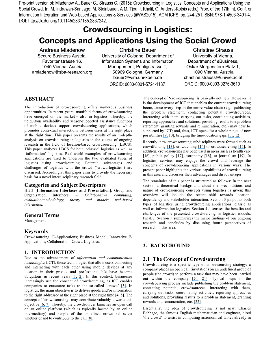 由于信息和通讯技术(ICT)的发展,那些允许用户在任何地点,在其私人和职业生活中,使用移动设备进行连接和交互的技术,在近年来变得无处不在。在这种情况下,企业越来越多地使用众包的概念,因为ICT使公司能够将任务外包给所谓的“群体”。在物流中,主要的目标是在合适的时间将商品和/或信息送到正确的地址。“众包”的概念可能对这个目标有价值。因此,众包雇主在一个在线平台上启动了一个开放的调用(通常由一个在线中介托管),而没有定义的群体的人可以自行选择是否接受调用。
