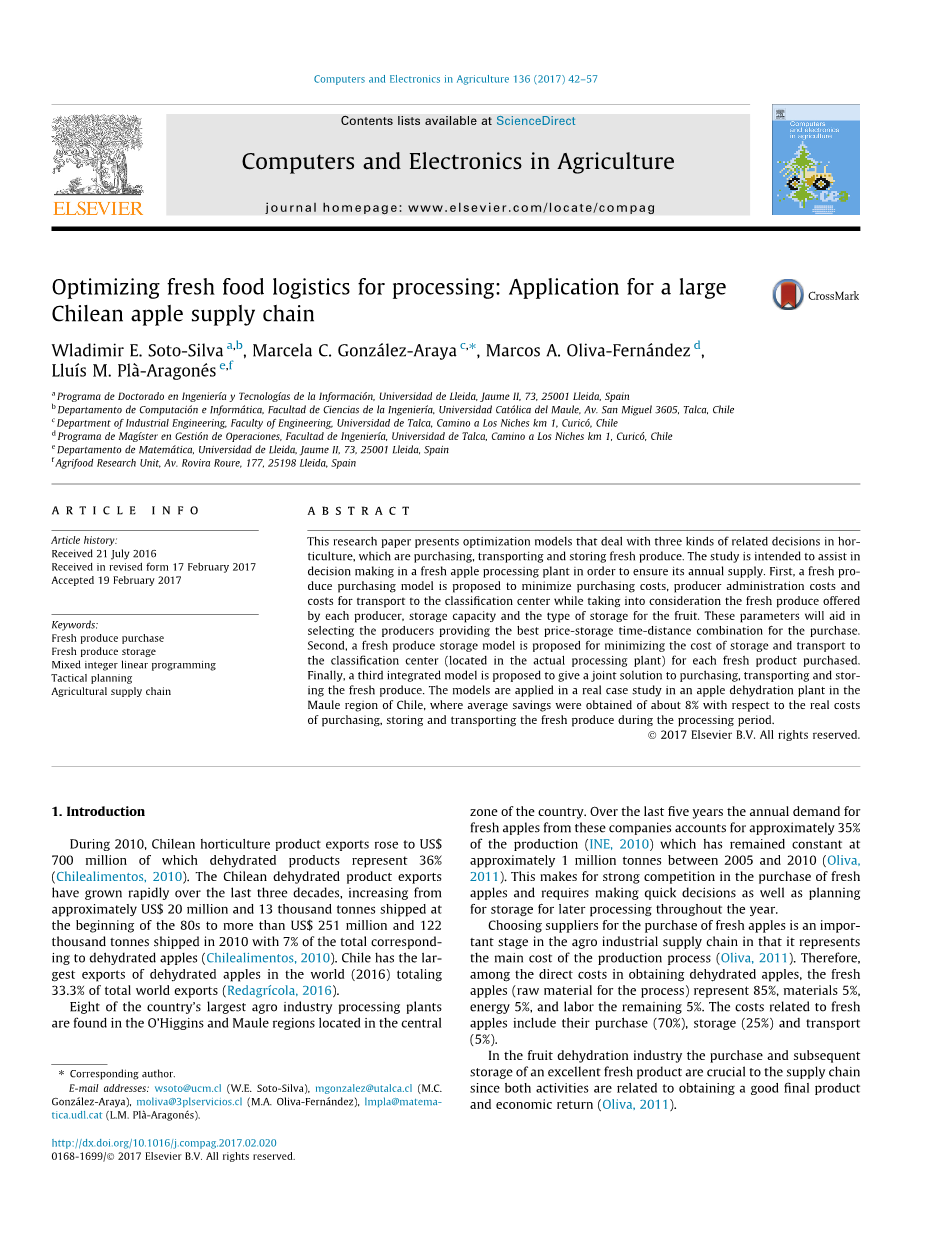 第一个模型的目的是帮助生产者选择从谁处购买新鲜水果,以寻求最大限度地减少采购,生产管理和水果运输的成本。第二种模式将最大限度地减少从各个生产者处购买新鲜农产品所产生的储存和运输成本,分配适当的冷藏室,以保持新鲜的水果,直到它被加工。第三个模型集合了前两个的,为了尽量同时减少所有的成本。在智利,该模型已被开发应用于改善苹果的物流供应链。然而,这些模型可以用于任何一种水果和蔬菜的供应链,必须考虑其存储在冷室处理前,其生理特征不随时间迅速恶化,该模型被应用于一个加工厂位于马乌莱地区,智利,涉及脱水苹果加工厂的运作的实际案例研究中。