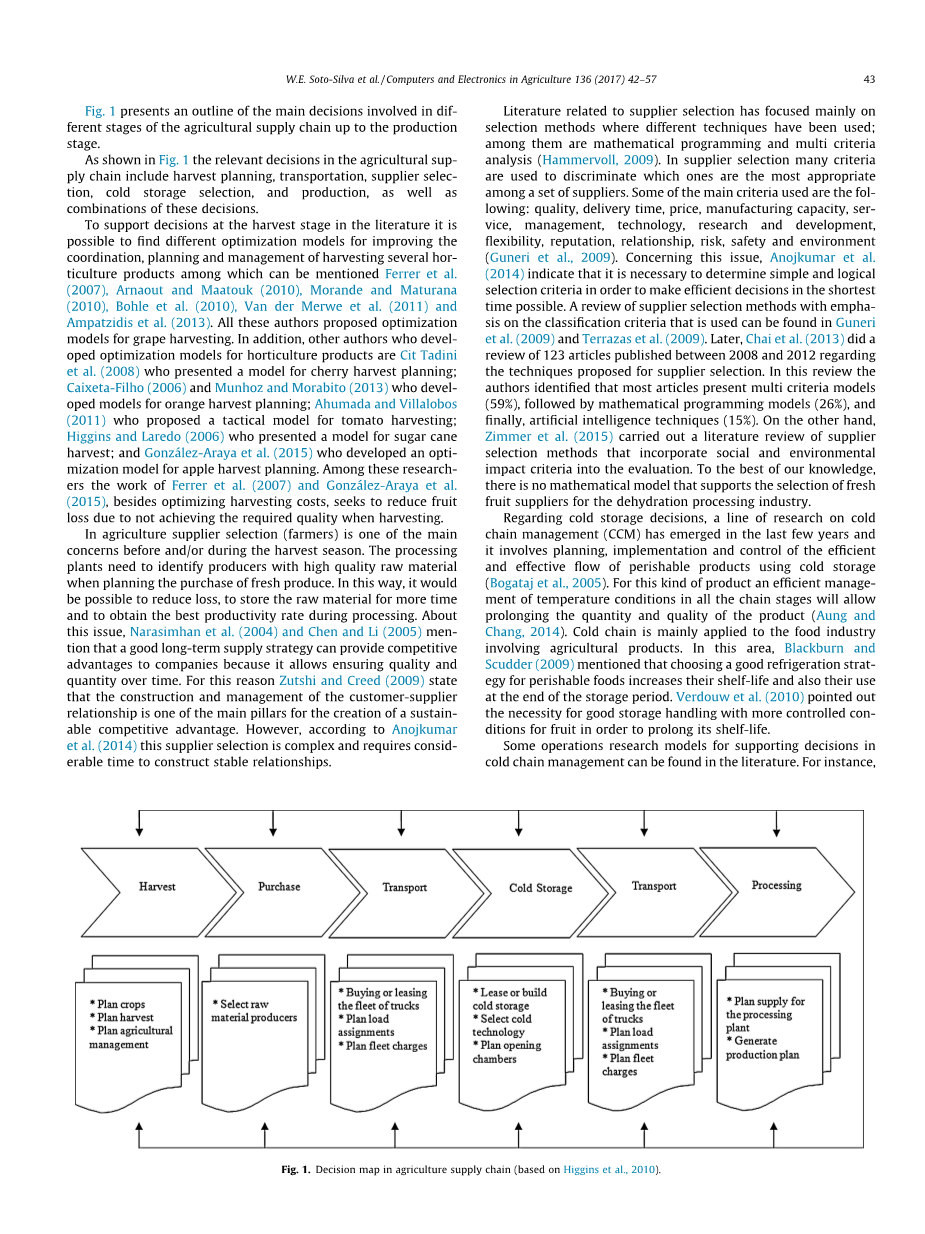 在农业供应商选择(农民)是收获季节之前和/或期间的主要关注点之一。 在规划购买新鲜农产品时,加工厂需要确定具有优质原材料的生产商。 以这种方式,可以减少损耗,将原材料储存更多的时间,并且在加工过程中获得最佳的生产率。 关于这个问题,Narasimhan等人 和Chen和Li认为,良好的长期供应战略可以为公司提供竞争优势,因为随着时间的推移,它可以确保其质量和数量。 因此,Zutshi和Creed指出,客户-供应商关系的建设和管理是创造可持续竞争优势的主要支柱之一。 然而,根据Anojkumar等人认为该供应商的选择是复杂的,需要相当长的时间来建立稳定的关系。
